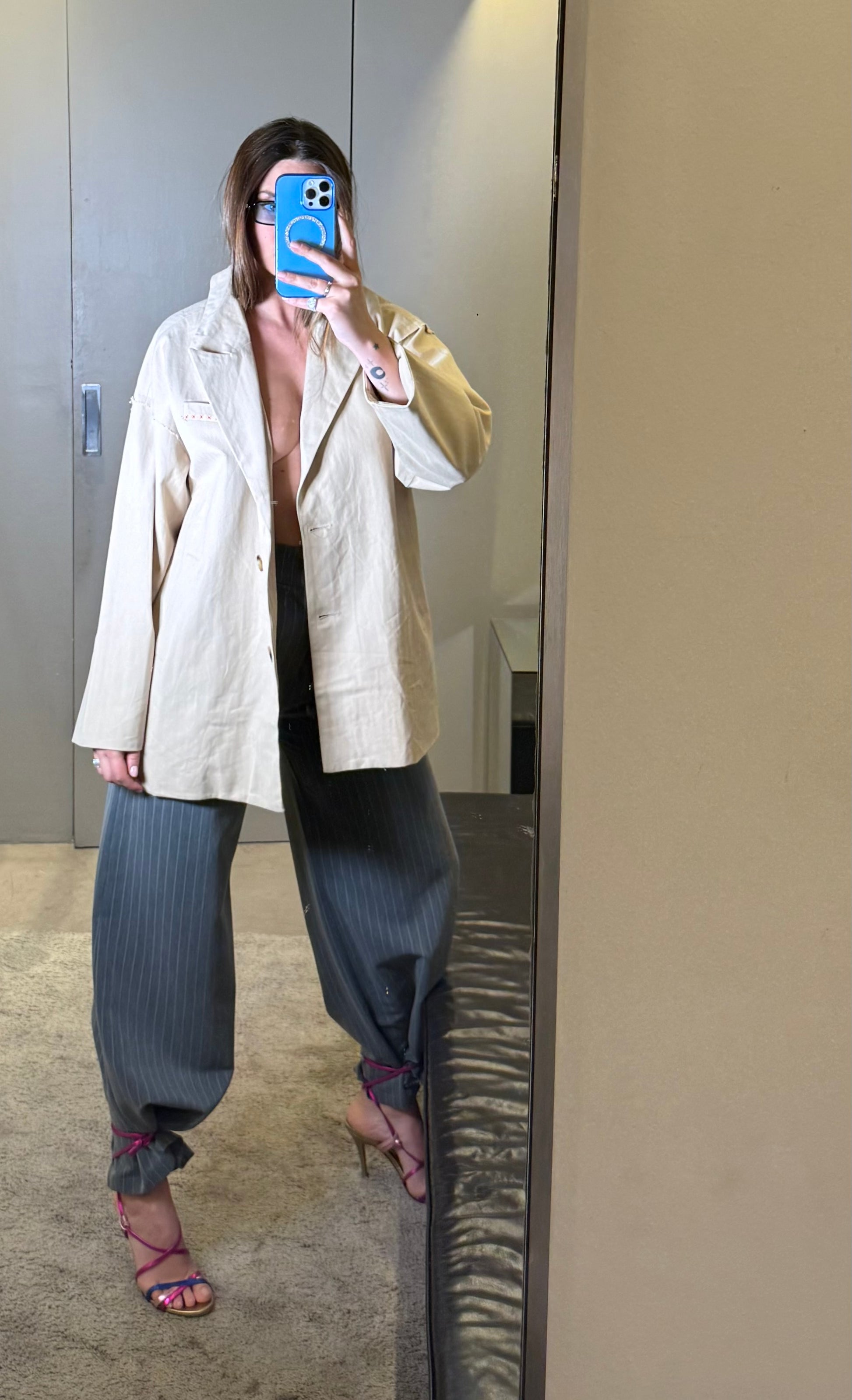 Blazer over fit dal design contemporaneo, realizzato in cotone color beige sabbia. La linea è morbida e destrutturata, con spalle scese e maniche ampie che donano un’attitudine rilassata ma sofisticata. Chiusura frontale con bottoni e rever classico, perfetto da indossare sia aperto che abbottonato.