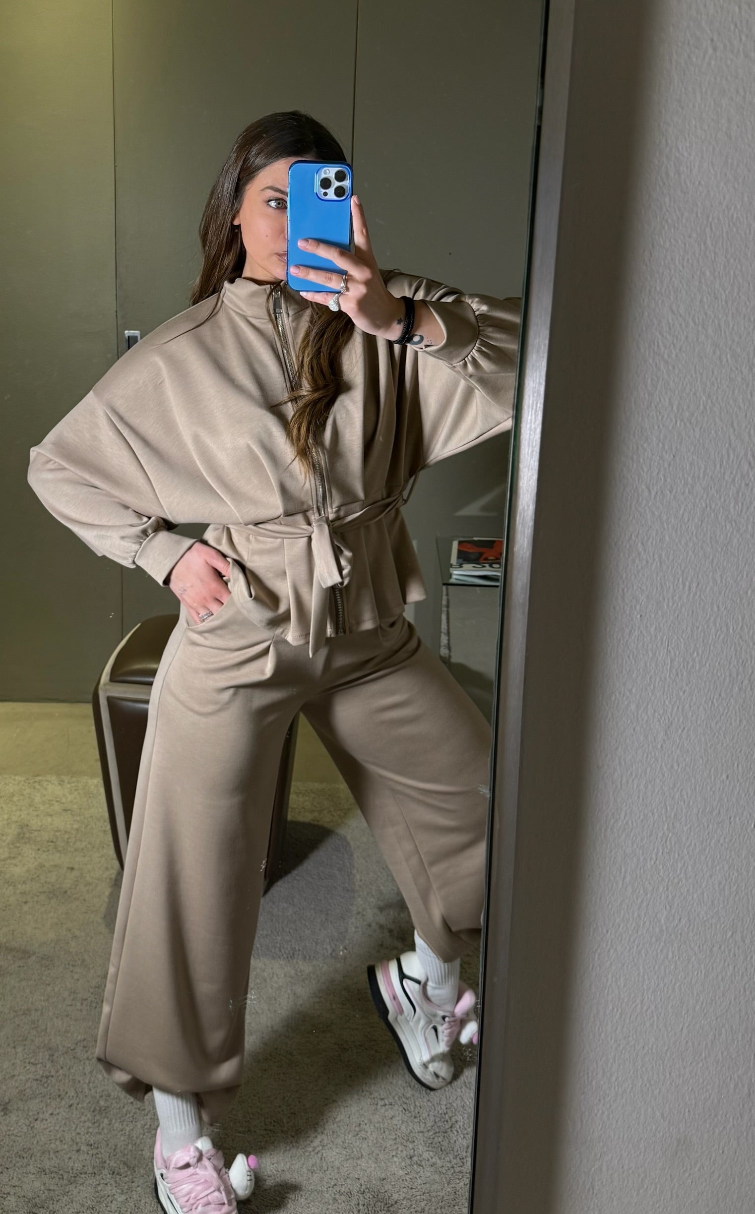 La giacca presenta collo alto, maniche lunghe e cintura in vita che valorizza la silhouette, con balza sul fondo per un dettaglio femminile. Il pantalone ha gamba dritta e ampia, vita regolare e vestibilità confortevole.