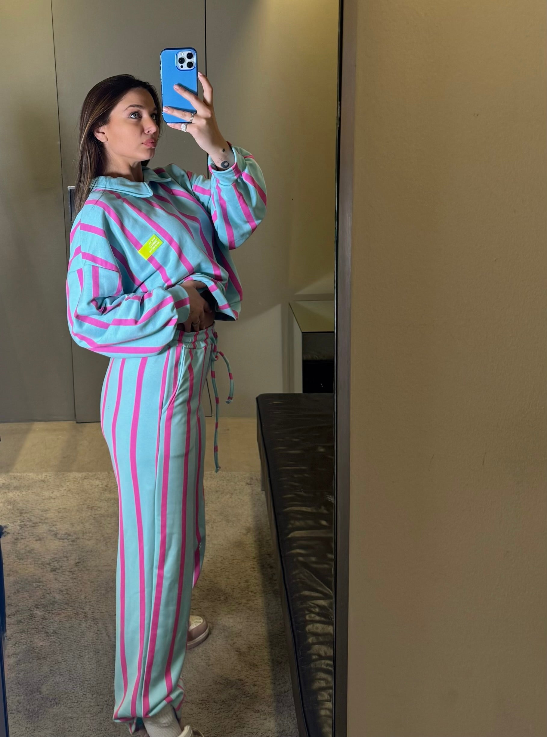 Questo completo ha uno stile sportivo e vivace, perfetto per chi ama un look casual ma originale. È composto da felpa e pantalone coordinato con fantasia a righe verticali fucsia su base verde acqua, un abbinamento fresco e d’impatto.