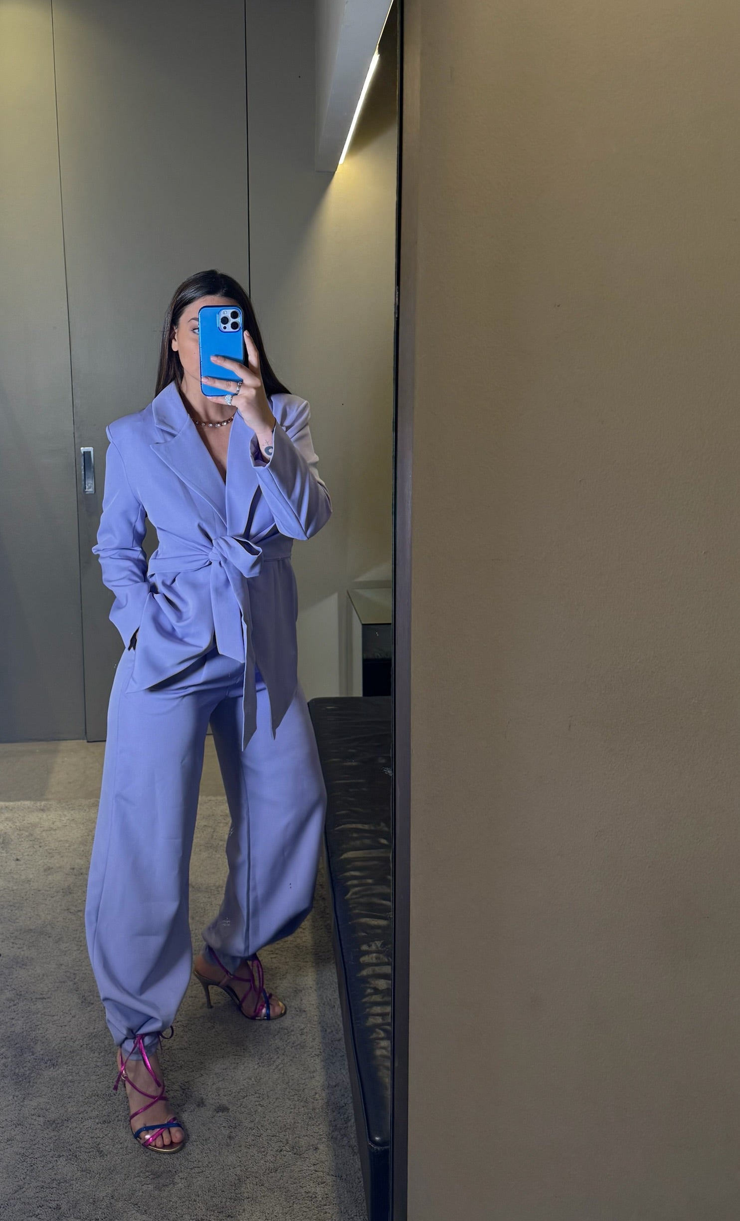 Questo tailleur è un completo elegante e contemporaneo in una delicata tonalità lilla pastello. La giacca ha una linea strutturata con rever classico e una vestibilità leggermente morbida che valorizza la silhouette. Il dettaglio distintivo è la cintura, attaccata direttamente alla giacca, che si annoda sul davanti creando un raffinato effetto drappeggiato e sottolineando il punto vita in modo armonioso.